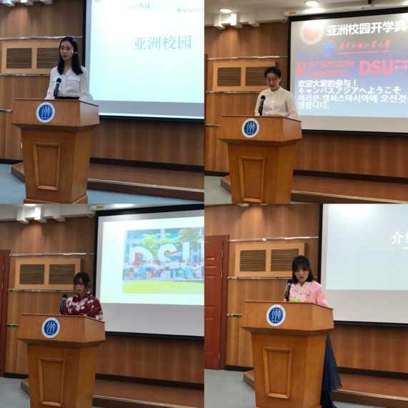 此外,廣外17級學生代表、18級新生代表、日本立命館大學、韓國東西大學學生代表先後分别用中日韓英四種語言發言。表達了自己參加亞洲校園項目的感受、分享了海外留學的學習與生活體驗,也提出了對自己的要求。