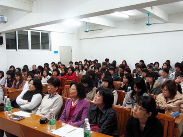 千葉由紀子和藹友善,在輕松的氛圍下向大家介紹了自己學習漢語的經曆。千葉于1966年就讀北九州大學中文系。在文化大革命時期,中日兩國尚未建交的情況下,依然堅持每天收聽北京的廣播來學習中文。1972年中日邦交正常化後,就職于福岡市政府國際部。直至去年退休為止是市政府中唯一一位在職期間沒有更換工作崗位的公務員,從事了三十餘年的中日友好交流工作。曾在暨南大學留學一年的千葉結合自身的經曆感慨地說:“留學對語言的提高,對文化的理解是很關鍵的一步。如果有條件的話,學外語的人還是需要有一些留學經驗的。”